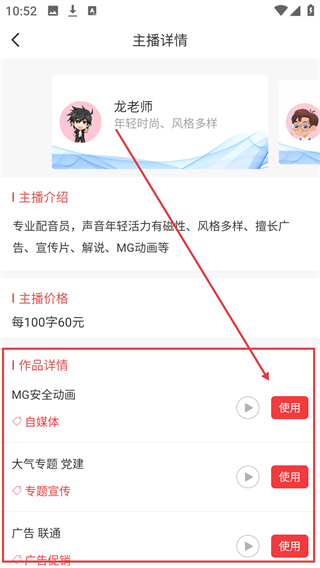 4、在主播详情页,点击作品旁的【使用】按钮,选定该主播的配音风格,用于后续的文字转语音制作啦。
