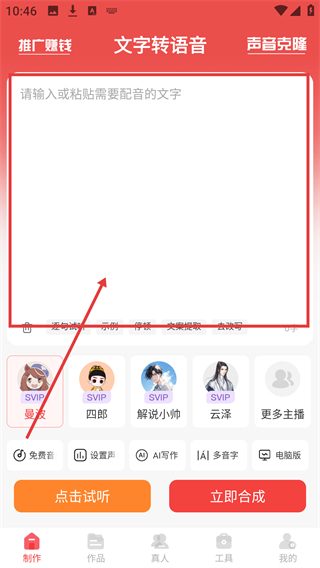 1、在文字转语音页面,先在输入框填写需要配音的文字,再选主播音色,就能准备后续操作啦。