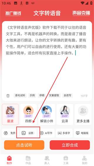 2、填好文字选好主播后,点击【设置】按钮,就能打开声音相关的配置选项界面哦。