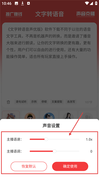 3、在声音设置页,可调整【主播语速】【主播语调】,调完点【确定使用】就能应用设置啦。