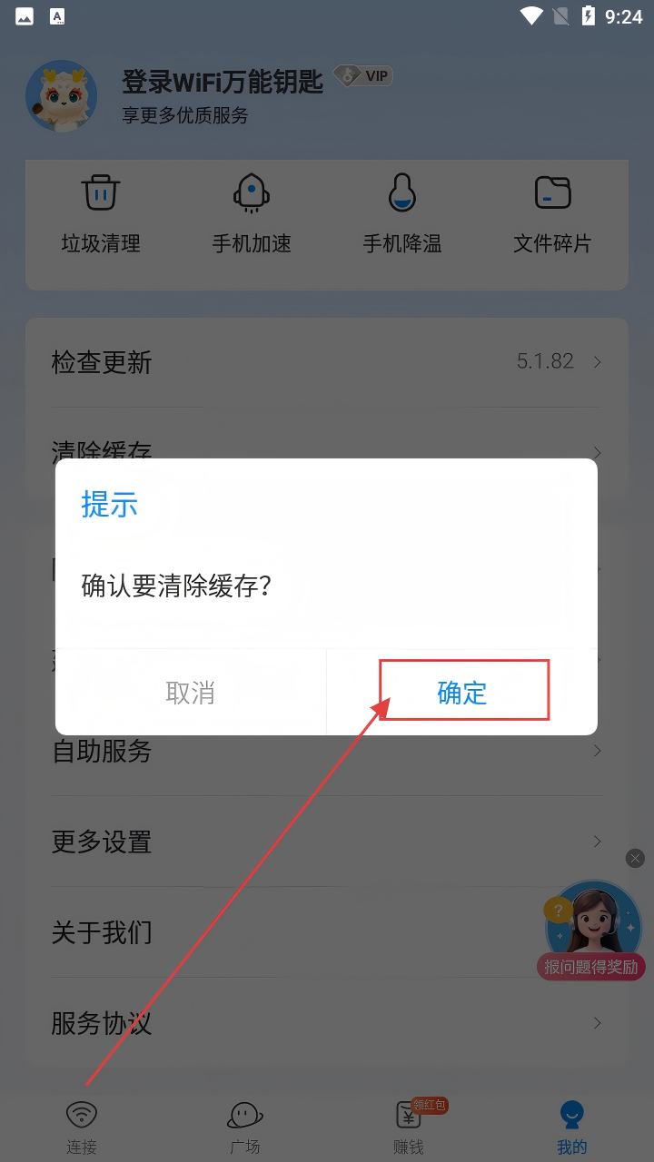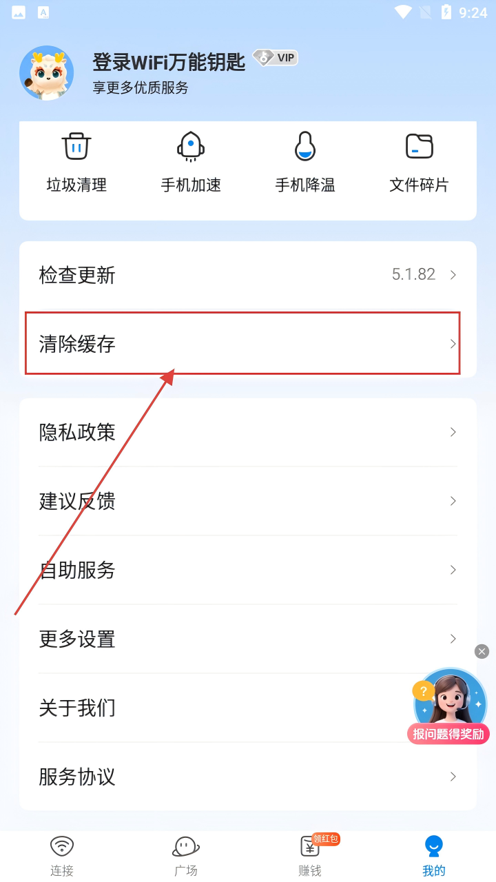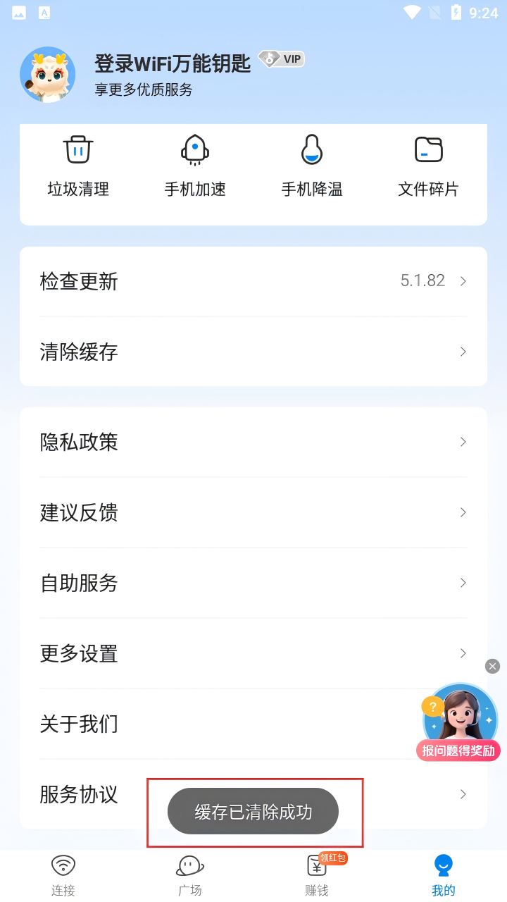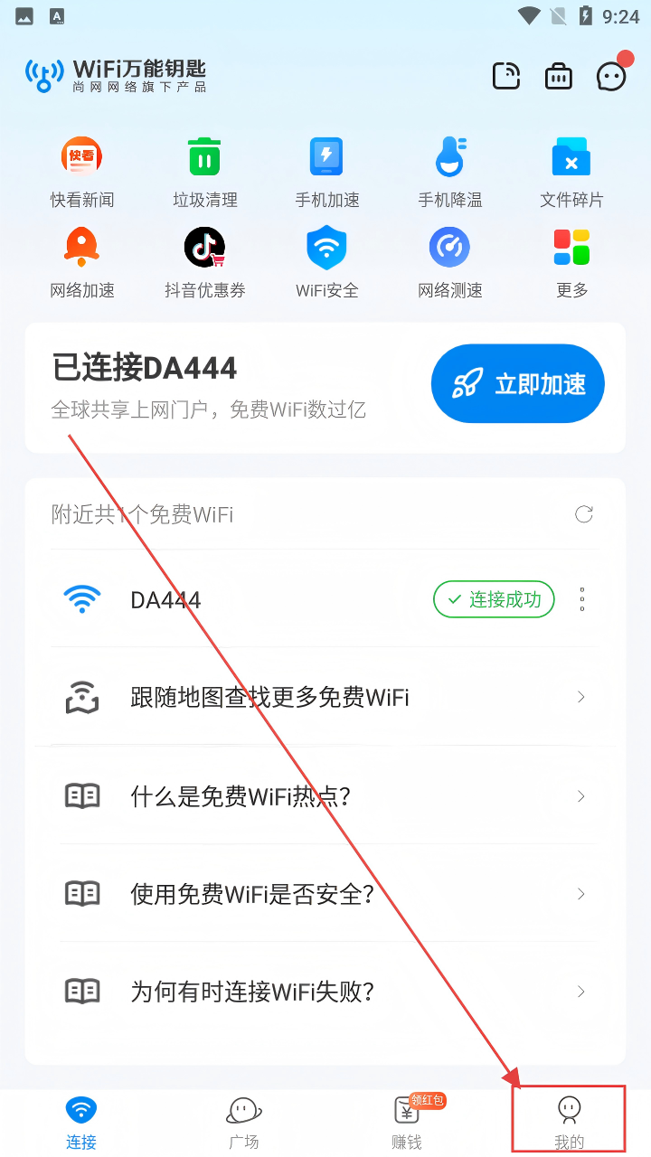 1、在WiFi万能钥匙主界面,点击右下角【我的】按钮,进入个人页面,开启清理缓存操作啦。