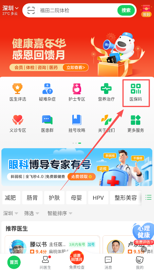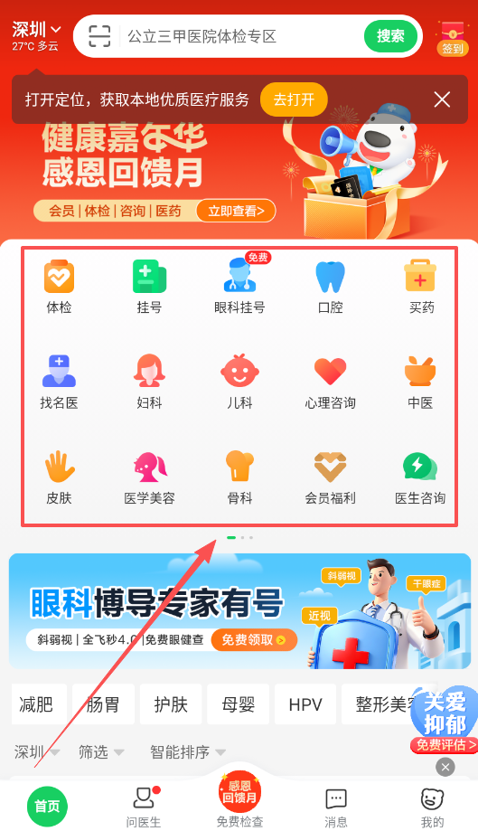 2、进入主界面后别急着找科室,先留意顶部的搜索栏和“公立三甲体检”等专题活动,快速直达服务。