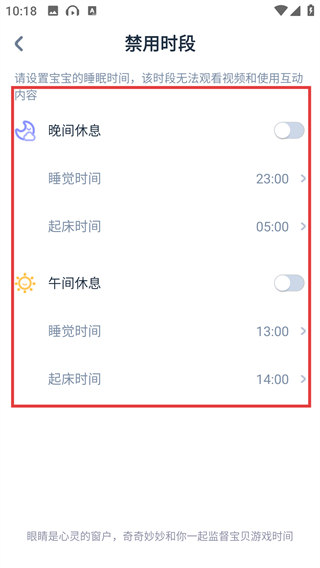 4、进入禁用时段页面后,可开启【晚间休息】【午间休息】,并设置对应的睡觉和起床时间,限制使用时段啦。