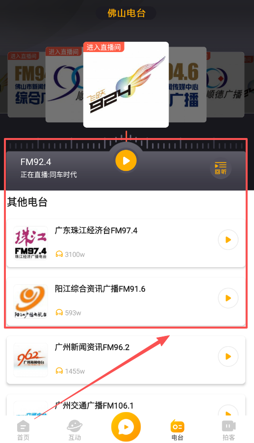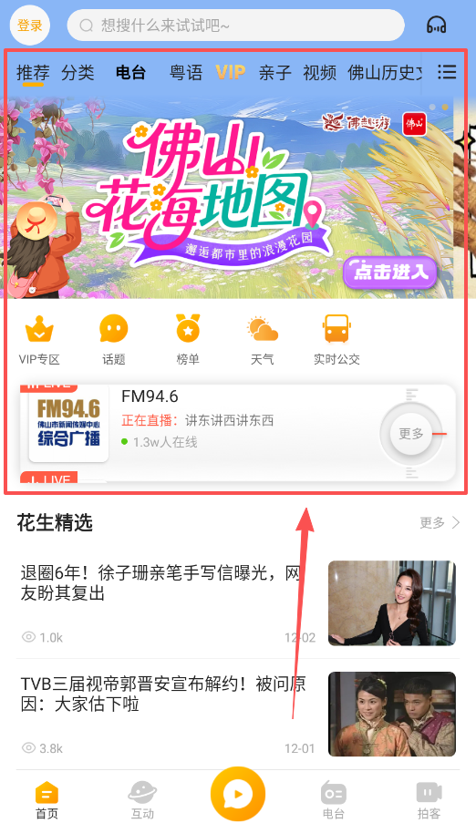 四、整个软件操作很聚焦本地和粤语内容呢,首页顶部有“佛山历史”、“花海地图”这类本地入口,收听直播或点播后。