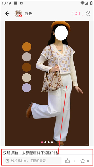 2、进入内容详情页后,能看到完整的穿搭展示和文案,还能给内容点赞、评论来互动呢。