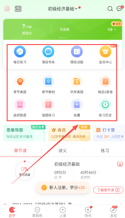 2、登录成功后进入学习主页,这里有很多学习模块可以选择,比如每日练习、薄弱专练、章节真题等功能。