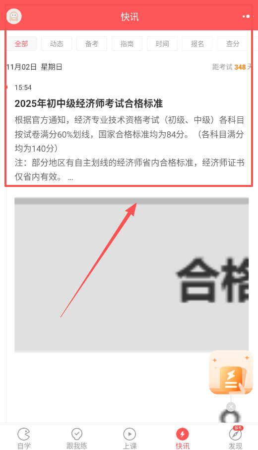 4、在快讯板块你能获取最新考试资讯,这里分类整理了动态、备考、指南等各类信息,比如考试倒计时、合格标准等重要通知。