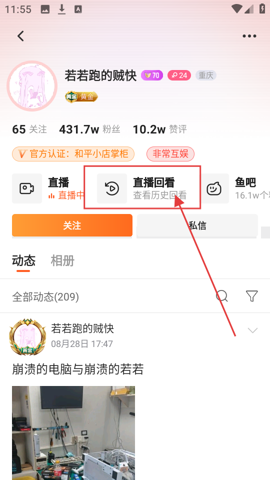 4、在主播个人主页点击【直播回看】,就能查看主播的历史直播回放,不错过精彩内容啦。