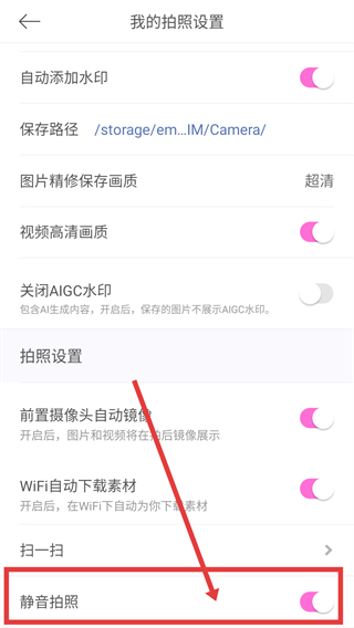 4、进入我的拍照设置页面,可找到【静音拍照】选项,通过开关按钮开启该功能,实现拍照无声音的效果呀。