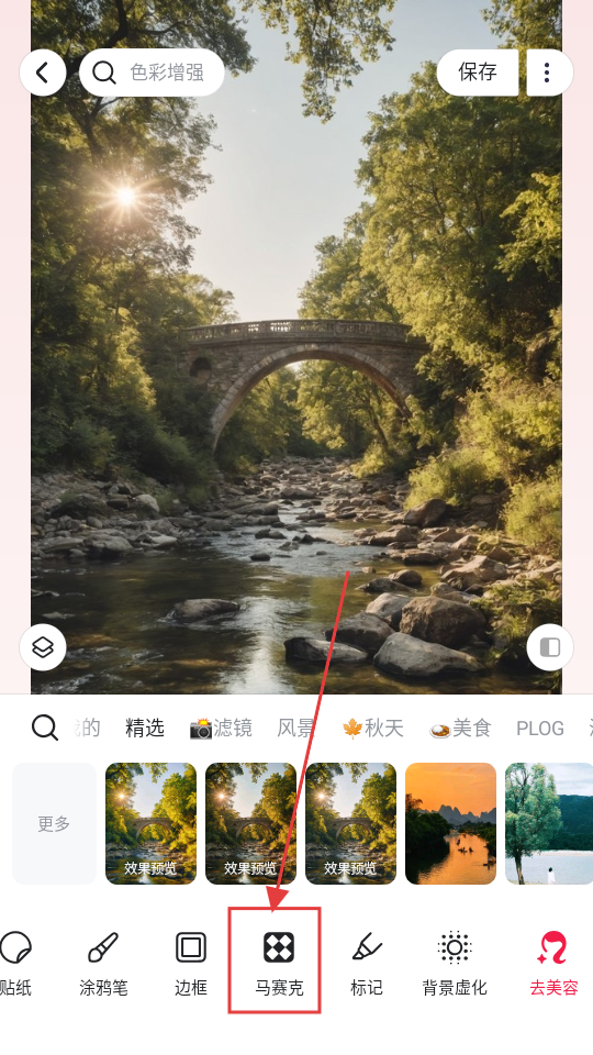 1、在图片编辑页面,点击【马赛克】,可进入马赛克功能页面,准备添加马赛克效果啦。