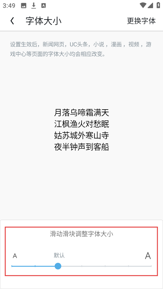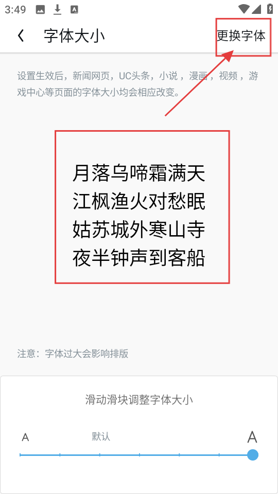 4、调整好字体大小后,要是想换字体,就点击右上角【更换字体】,去挑选喜欢的字体吧。