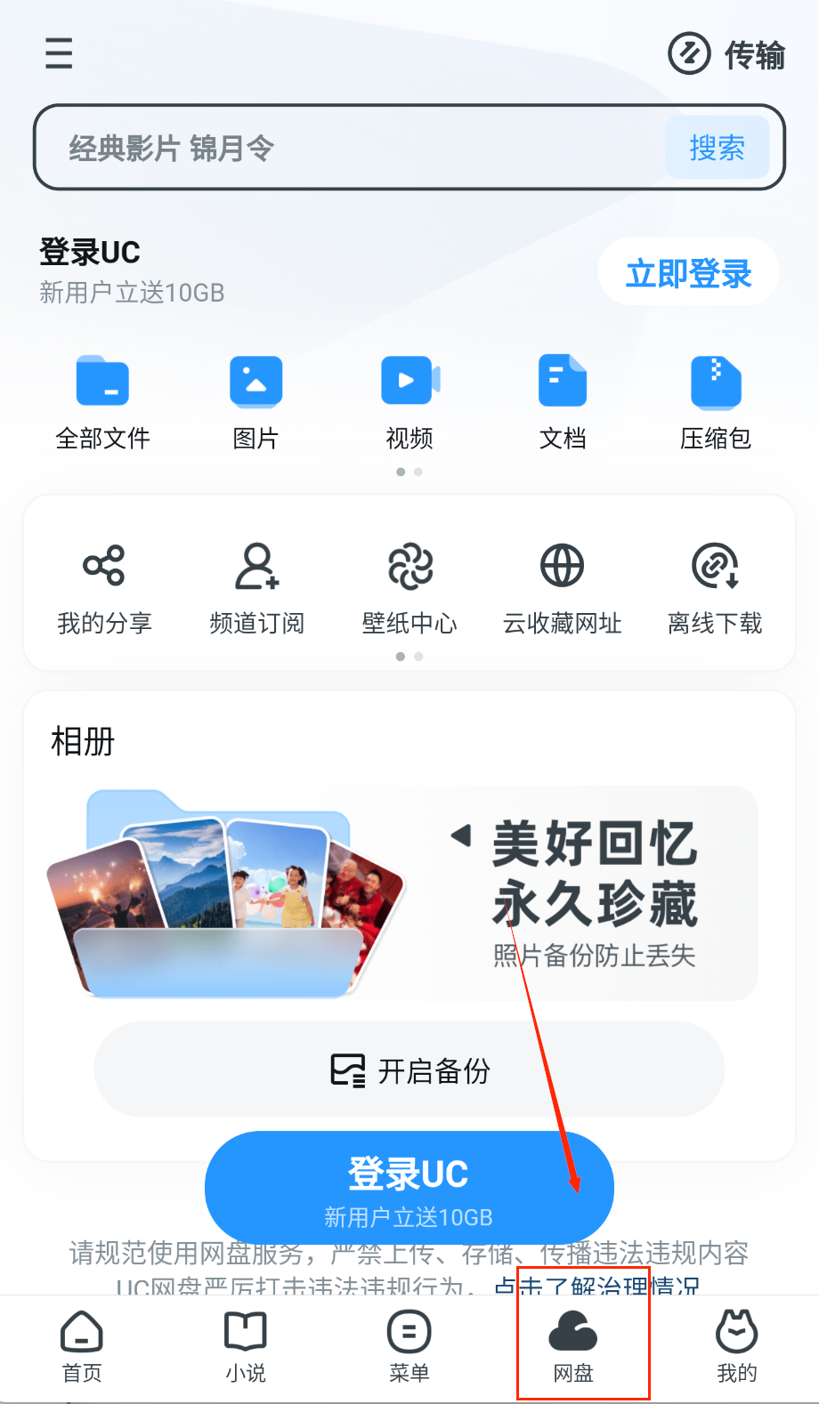 1、要使用完整功能需要先登录账号,在首页或“我的”页面点击“立即登录”按钮,新用户还能获得10GB免费空间。