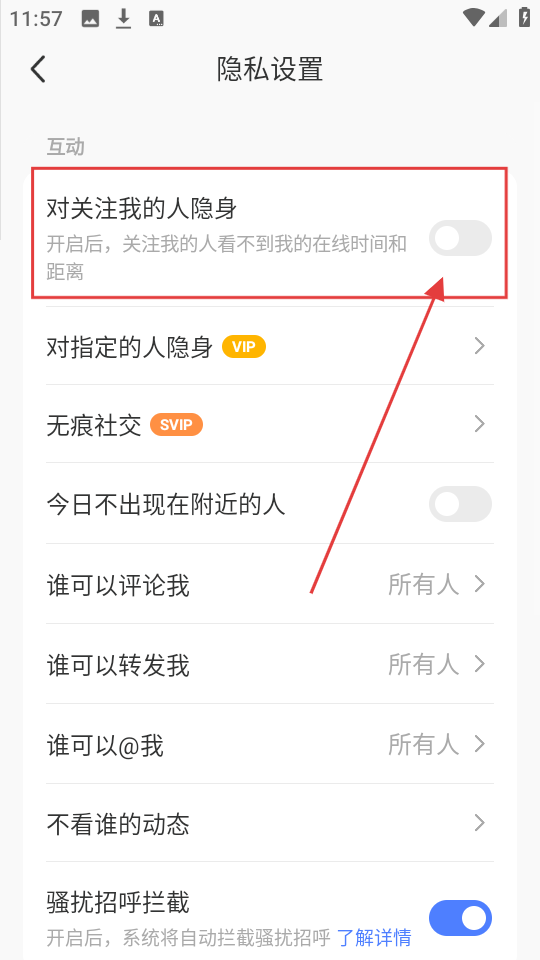 3、在隐私设置页面,找到【对关注我的人隐身】选项,点击其开关按钮呢。