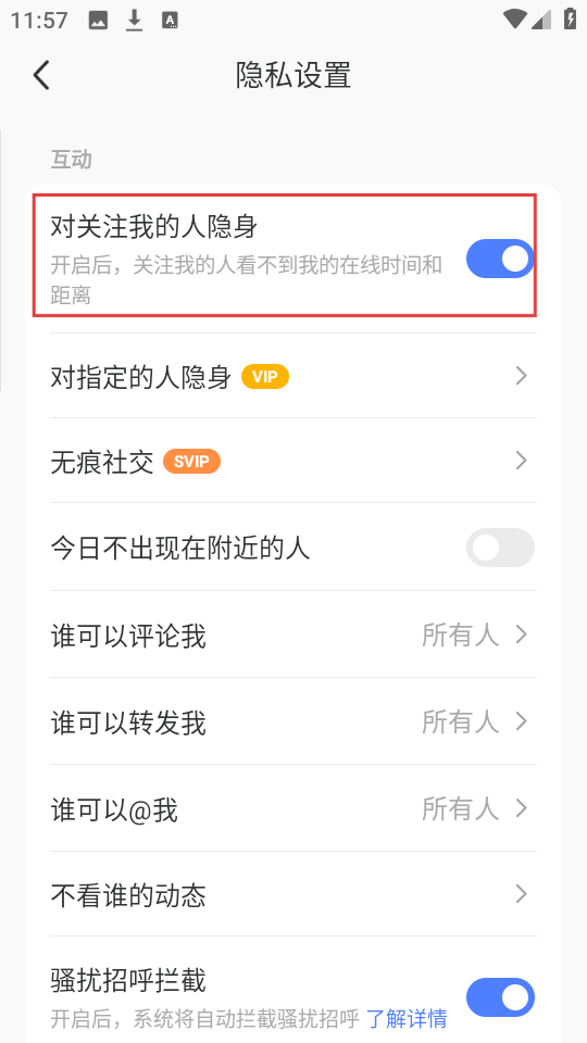 4、开启【对关注我的人隐身】后,关注我的人将看不到我的在线时间和距离,保护隐私啦。