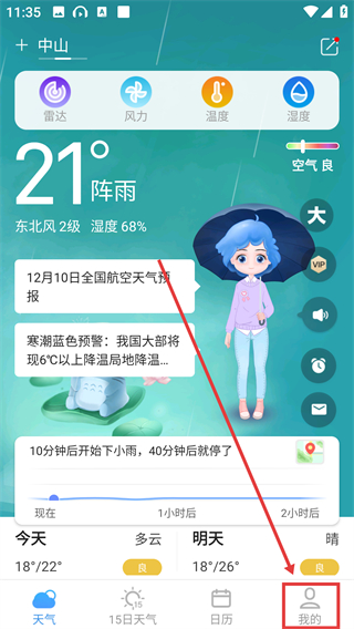 1、在天气首页点底部【我的】选项,能进入个人功能页,后续可设置天气相关的个性化功能啦。