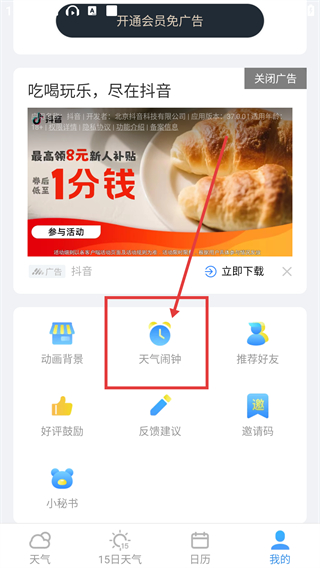 2、进入个人页后点【天气闹钟】选项,能跳转到语音闹钟设置界面,配置天气相关的闹钟哦。