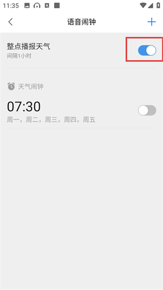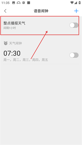 3、在语音闹钟页能看到【整点播报天气】的开关,当前是关闭状态,可手动开启该功能哦。