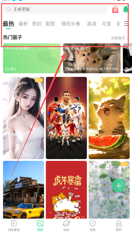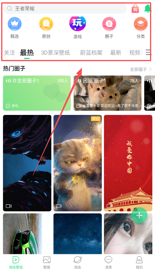 1、在首页上你就能够看见许多的壁纸可供选择,选择自己喜欢的类型,找到想要的动态壁纸;