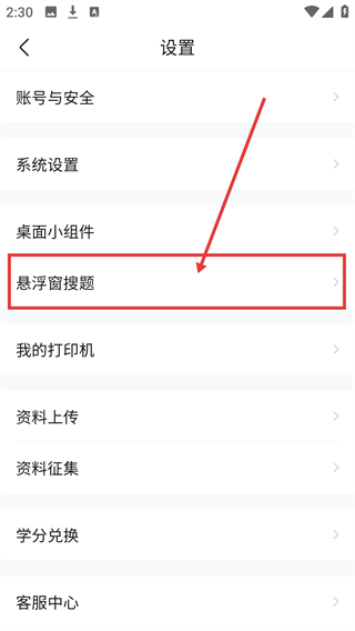2、在设置页里选择【悬浮窗搜题】选项,就能进入该功能的具体配置页面哦。