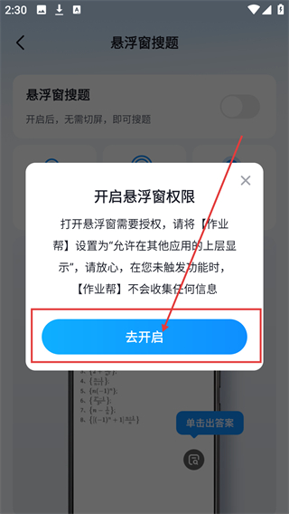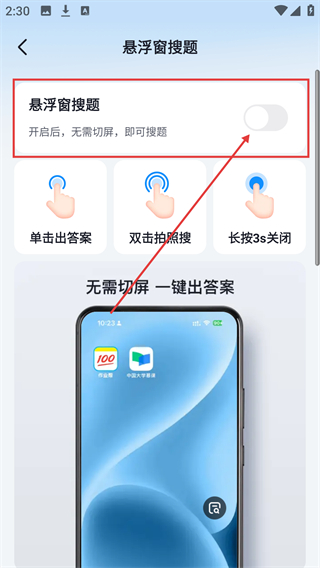 3、进入悬浮窗搜题页后,点击对应的开关按钮,就能尝试开启这个无需切屏的搜题功能啦。