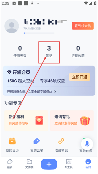 1、在“我的”页面,点【笔记】选项,可进入笔记相关页面,查看已创建的笔记内容哦。