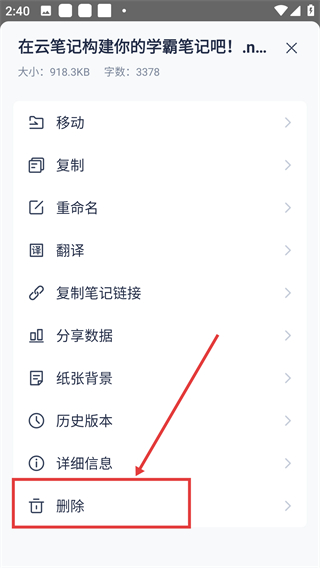 4、展开操作菜单后,点【删除】选项,就能启动笔记删除流程,管理不需要的笔记内容哦。