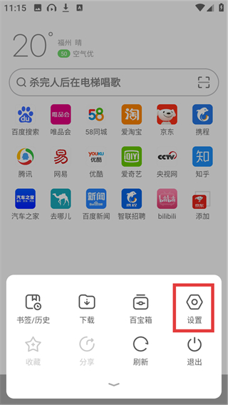 2、在功能菜单中选择【设置】选项,就能进入设置页面,调整浏览器的各类配置参数哦。