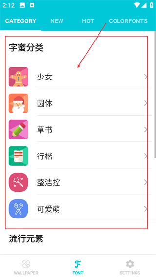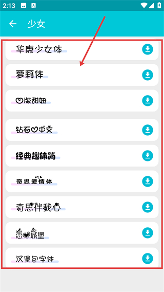 1、在字体应用的分类页面,选择心仪的字体分类(如【少女】),就能进入该分类下的字体列表页面啦。