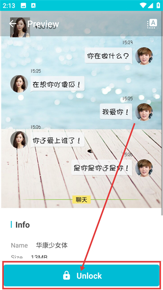 3、在字体预览页面,确认字体效果后点击【Unlock】按钮,就能解锁该字体的使用权限啦。