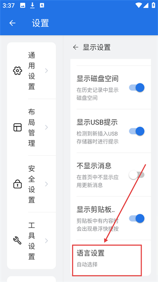 3、在显示设置页,点【语言设置】,可进入语言选择界面,更换应用的显示语言呢。