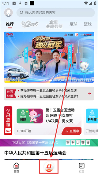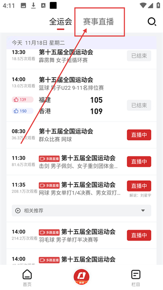1、在首页点击底部【直播】,进入直播界面,准备查看全运会相关赛事直播哦。