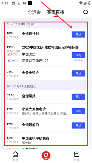3、在赛事直播列表里选择想观看的赛事,比如【全运进行时】,点击【预约】即可预约该直播哦。