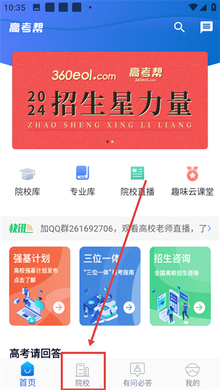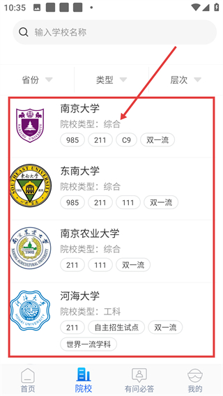 1、在首页,点底部的【院校】选项,可进入院校列表页面,查看各类高校的信息哦。