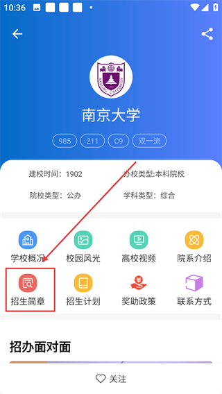 3、在院校详情页,点【招生简章】选项,可进入该院校的招生简章列表页面呢。