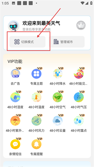 2、展开菜单后,点击【切换模式】选项,即可进入天气模式选择页面,挑选不同的功能模式哦。