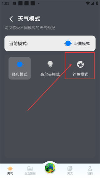 3、在天气模式页面,选择【钓鱼模式】选项,可切换到适配钓鱼场景的天气展示界面啦。