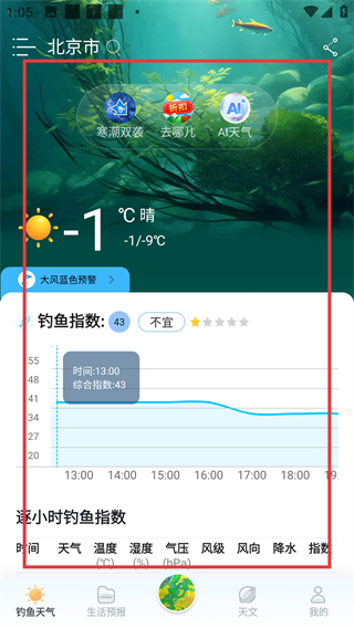 4、切换到钓鱼模式后,页面会展示钓鱼指数、逐小时相关数据,助力我们了解适合钓鱼的天气状况呀。