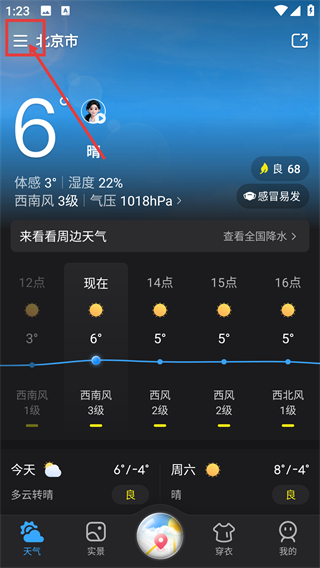 1、在天气应用主界面,点击左上角的菜单按钮,就能进入城市管理页面,添加或切换其他城市的天气啦。