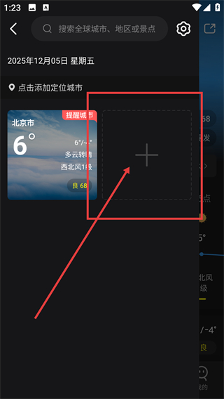 2、进入城市管理页面后,点击带加号的区域,就能打开城市选择界面,添加新的目标城市哦。