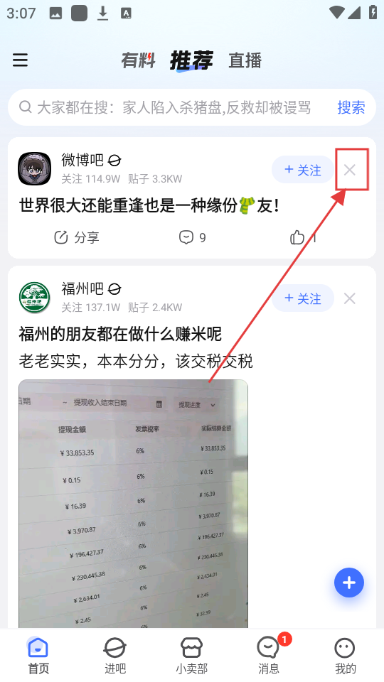 1、看到不想看的内容,别犹豫,点击内容右上角的【×】按钮,就能开启后续操作啦。