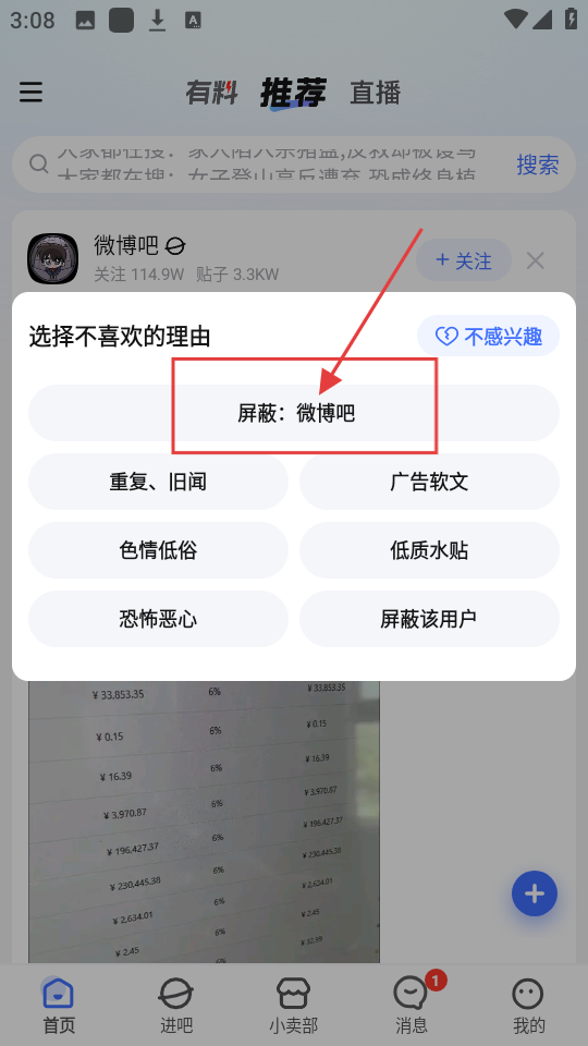 2、点击后会弹出选择不喜欢理由的窗口,直接选择【屏蔽:微博吧】,这样就能屏蔽相关内容。