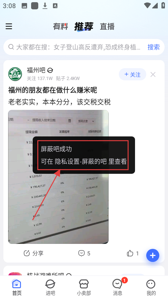 3、选择后会提示【屏蔽吧成功】,还能去隐私设置里查看屏蔽的吧,操作超顺畅。