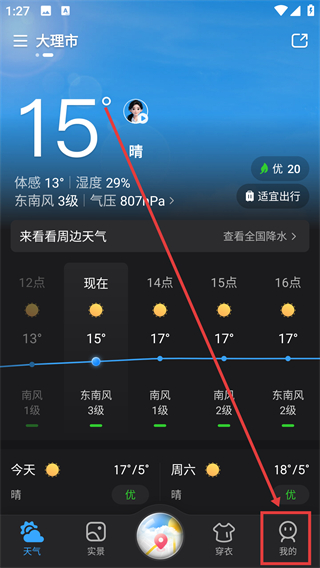 1、在天气应用首页点击底部的【我的】选项,就能进入个人中心页面,找到各类功能设置入口啦。