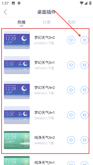 4、在桌面插件页的热推分类下,点击插件对应的下载按钮,就能获取该桌面天气插件啦。