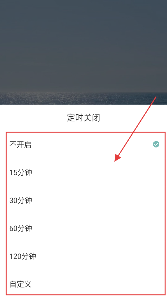 4、进入定时关闭设置页面,有【不开启】【15分钟】等选项,可根据需求选择定时关闭的时长。