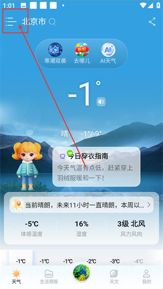 1、在天气首页点左上角菜单按钮,能展开功能页面,后续可找到城市管理相关的操作选项啦。