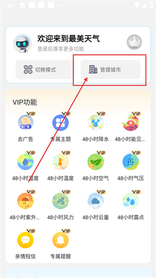 2、展开功能页后,点【管理城市】选项能进入城市管理界面,后续可添加或编辑关注城市哦。