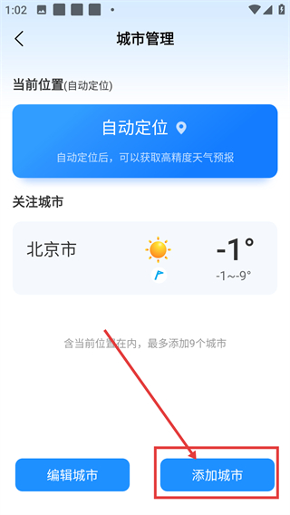 3、在城市管理页,点【添加城市】按钮能进入添加页面,后续可搜索并添加新的关注城市啦。