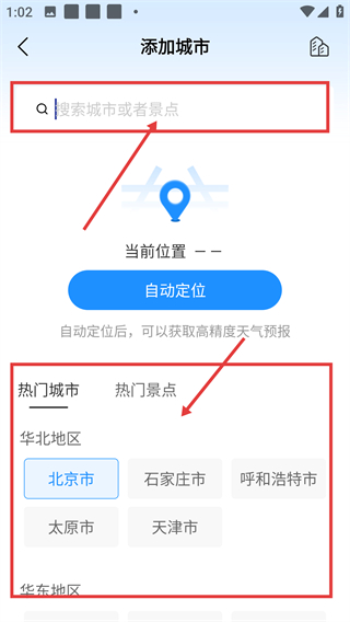 4、进入添加城市页,可在搜索框搜城市,也能选热门城市列表里的选项,快速添加关注城市哦。