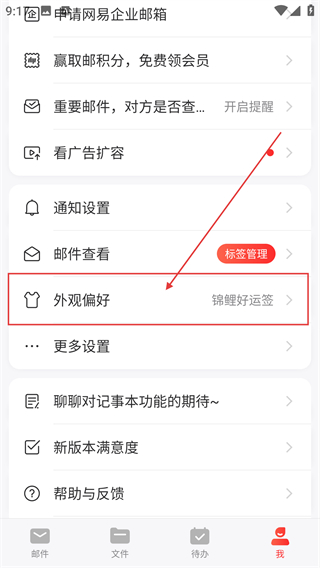 2、进入个人中心后,点击【外观偏好】选项,即可进入外观设置页面,调整邮箱的视觉样式哦。